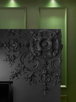 Fin dall’ingresso abbiamo creato un percorso immersivo: muri, soffitto e pavimento sono uniformati dallo stesso colore, mentre stucchi alle pareti celano porte e armadi. L’angolo cottura si nasconde dietro lo spazio di rappresentanza, trasformandosi nella testata di una parete grazie agli antichi stucchi reinterpretati in nero. Da questa si diparte, sospeso, un tavolo da riunioni che sembra dissolversi grazie alla superficie riflettente.